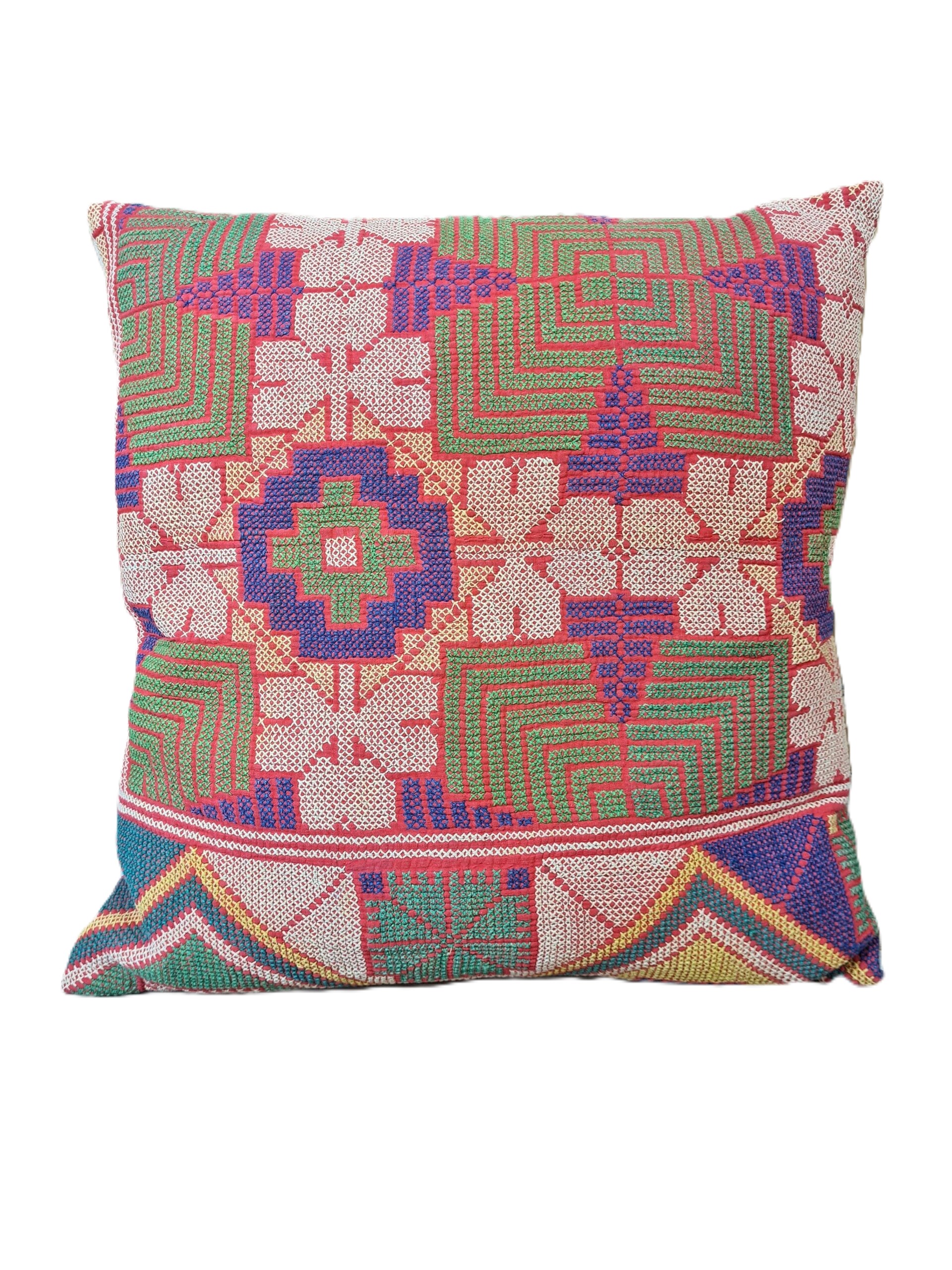 Each cover has been made from part of a repurposed Galicha Quilt, backed with natural linen fabric to frame this exquisite embroidery. Galicha Quilts (Carpet Kantha) are made from layers of recycled cotton saris and hand-embroidered with vivid geometric patterns in couched cross-stitch. Perfect in their imperfections each piece is unique. A product of female resourcefulness and creativity, made in Northern Bangladesh mid 1900s. Every quilt is carefully selected for its condition, design, and authentic appeal. Freshly washed to ensure softness.