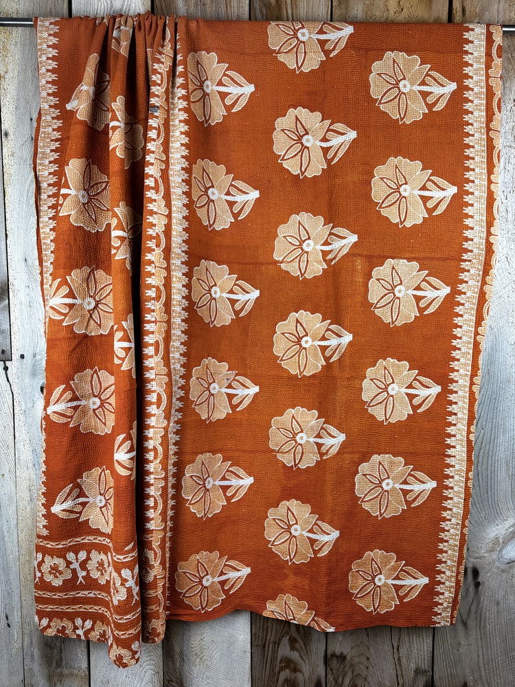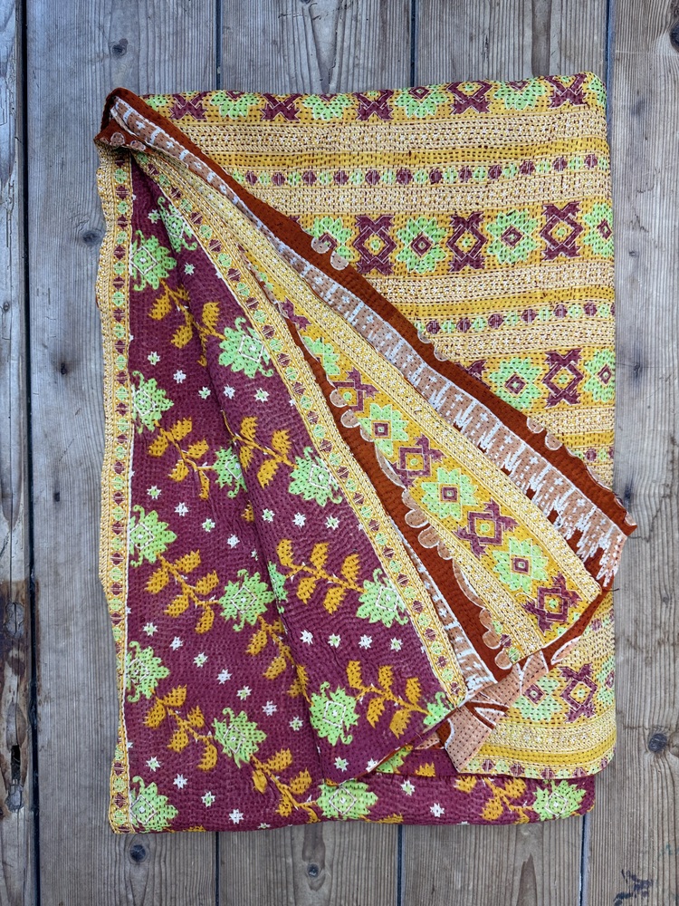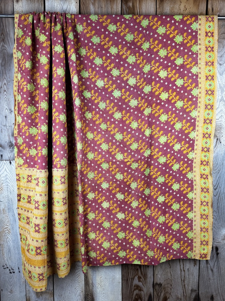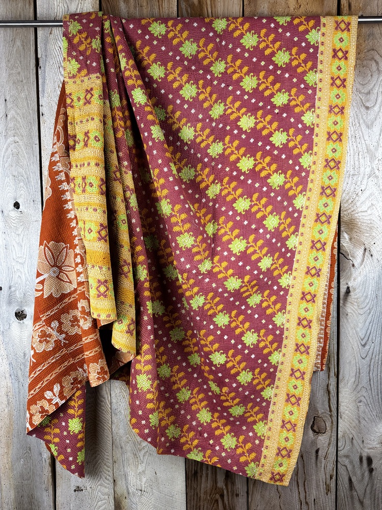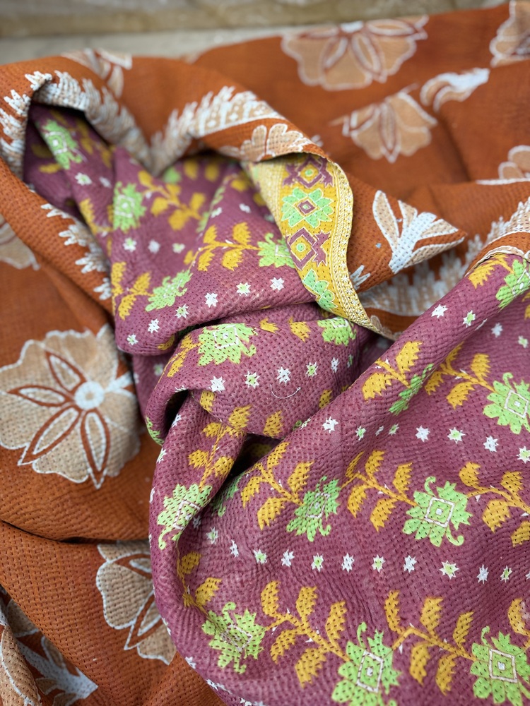 Perfect in their imperfections, each piece is unique. This finely-stitched kantha quilt is made from up to 6 layers of vintage 100% cotton sari and sewn together with thousands of tiny running stitches. A product of female resourcefulness and creativity, Kantha is an age-old Indian tradition. Fabrics are between 40-80 years old. Every quilt is carefully selected for its condition, design, and authentic appeal. Freshly washed to ensure softness.