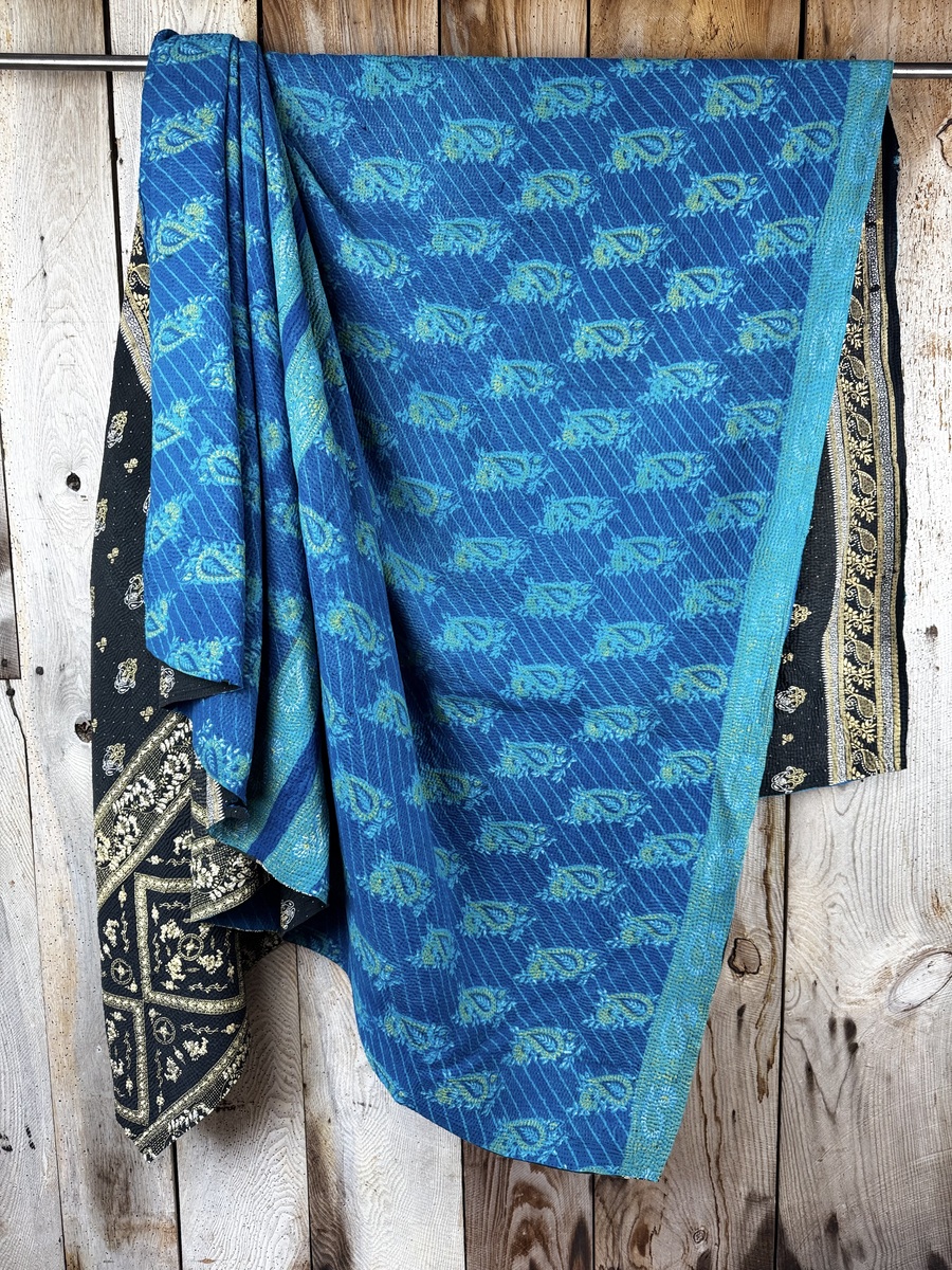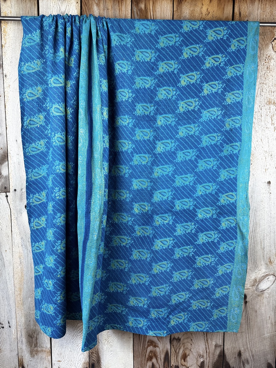 Perfect in their imperfections, each piece is unique. This finely-stitched kantha quilt is made from up to 6 layers of vintage 100% cotton sari and sewn together with thousands of tiny running stitches. A product of female resourcefulness and creativity, Kantha is an age-old Indian tradition. Fabrics are between 40-80 years old. Every quilt is carefully selected for its condition, design, and authentic appeal. Freshly washed to ensure softness.