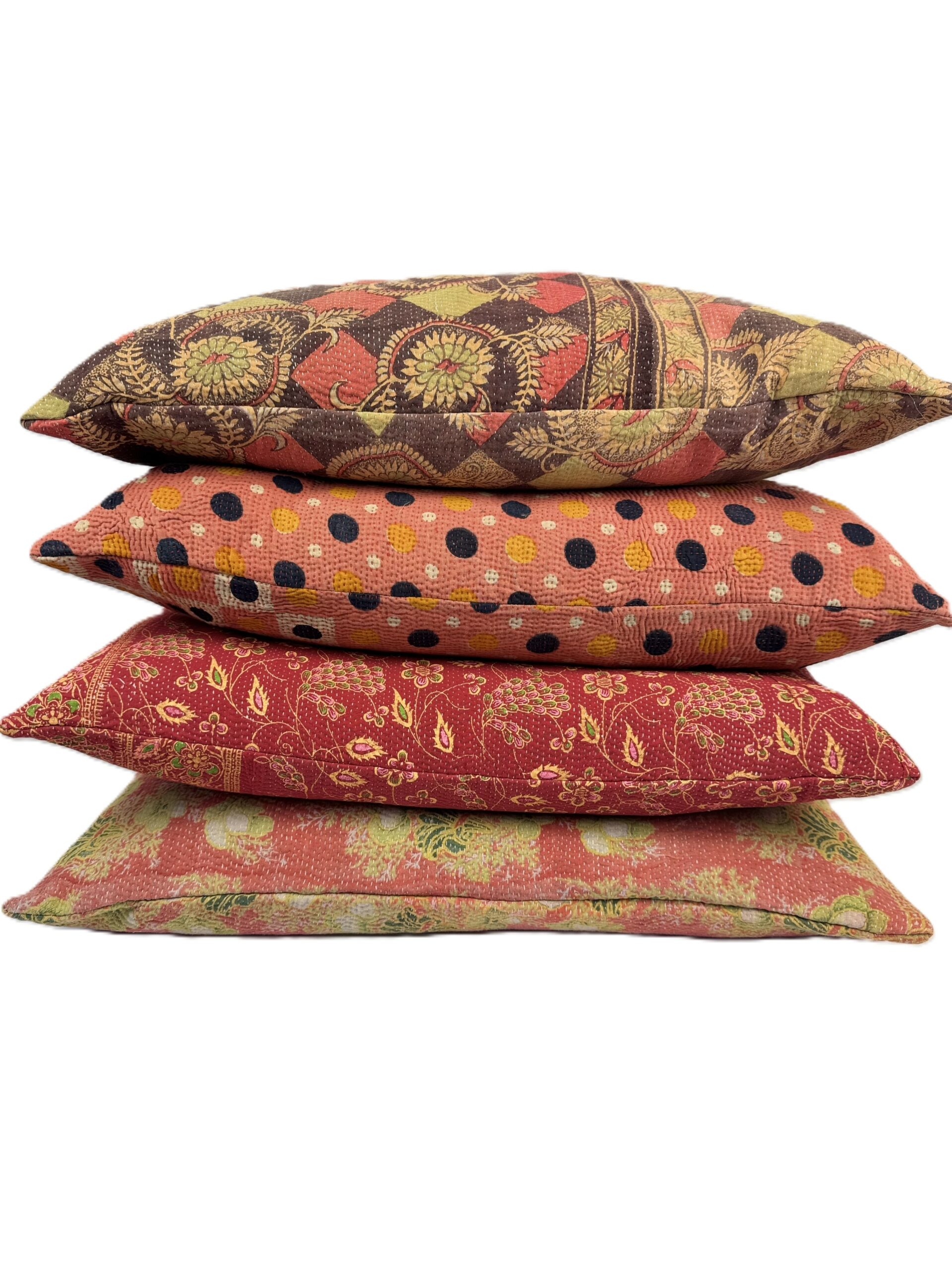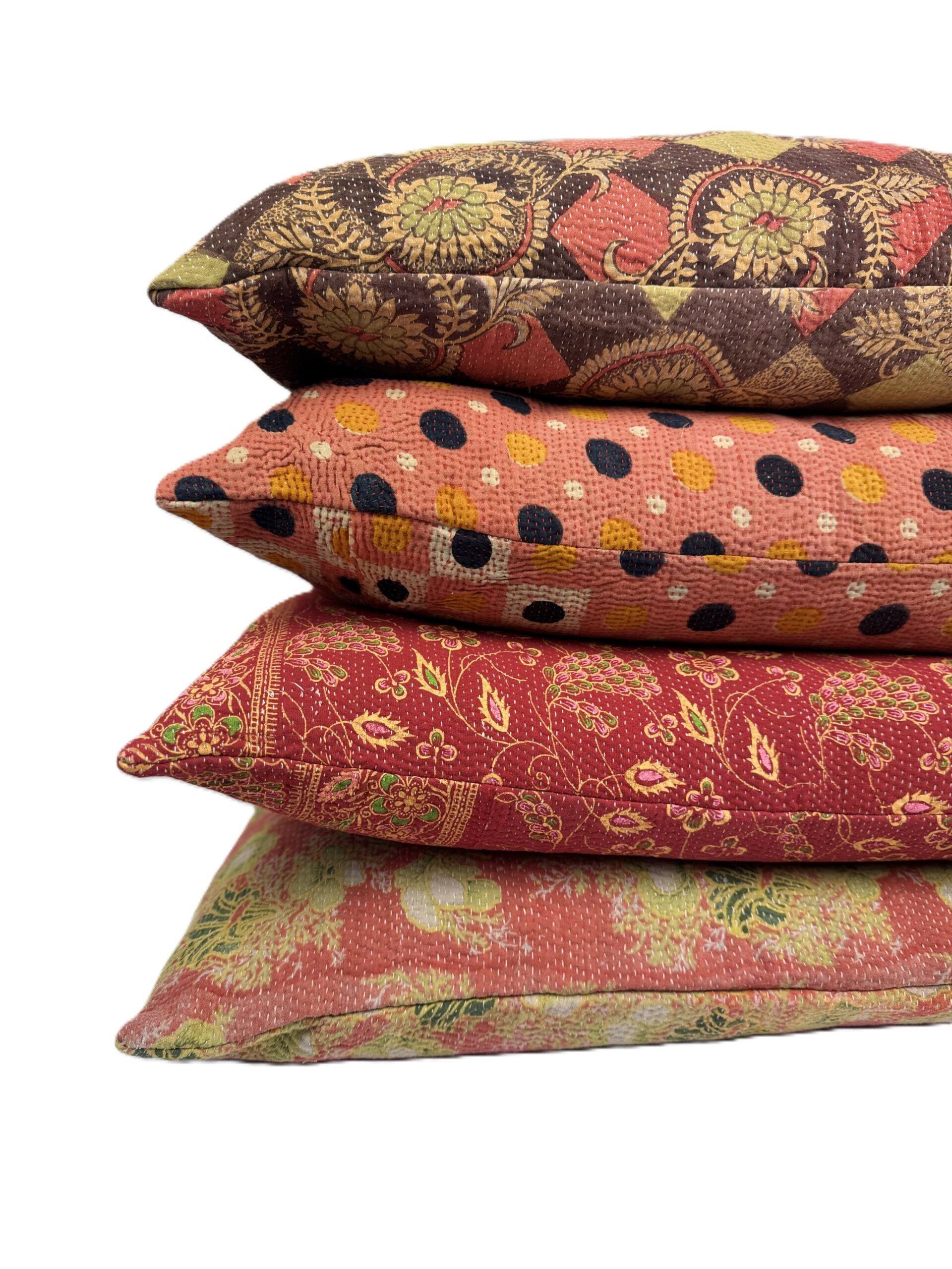 Each cover is carefully made from a repurposed kantha quilt. Kantha, the name given to an age-old embroidery technique. Layers of cotton saris are bound together with tiny running stitches creating a unique quilted surface