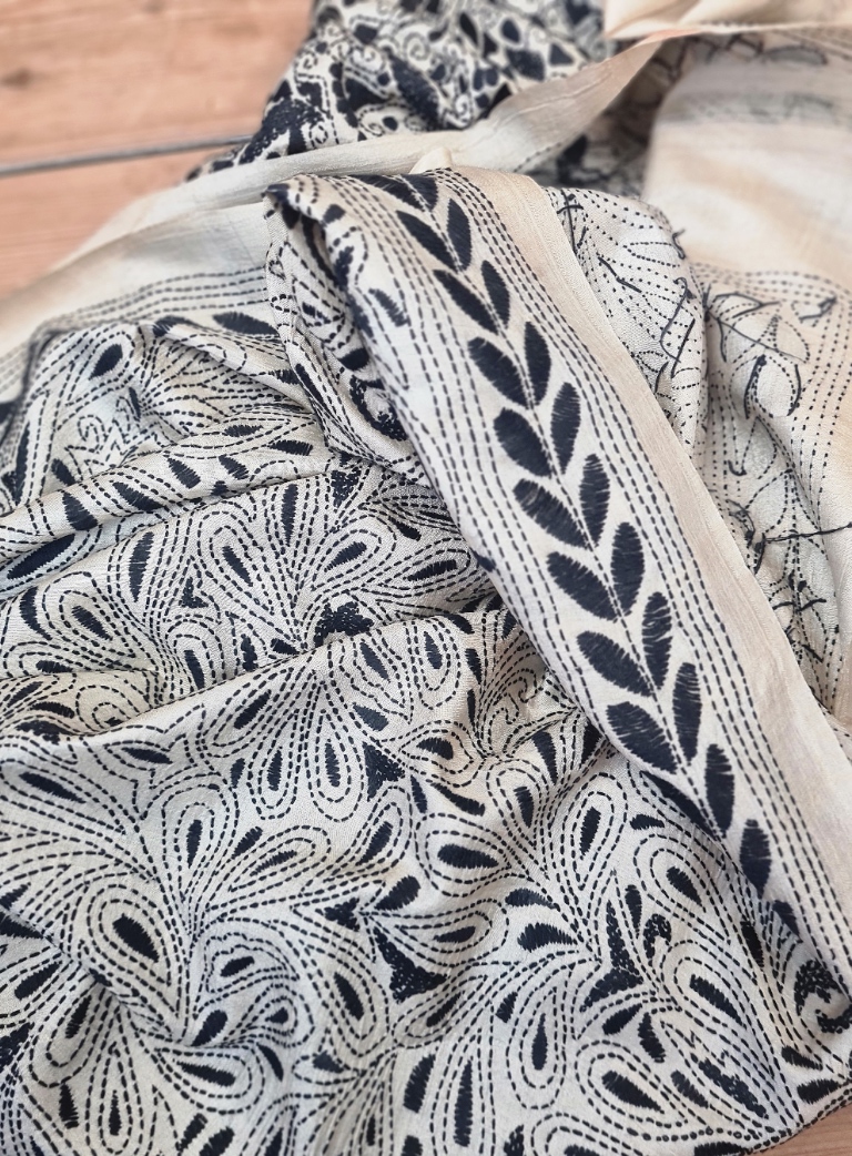 Tussar silk hand embroidered with fine cotton thread, Hand wash in cold water, allow to drip dry. In order to protect this fine work, it is advisable to cover it with a clean damp cloth before ironing. When new the fabric is crisp becoming beautifully soft when worn.