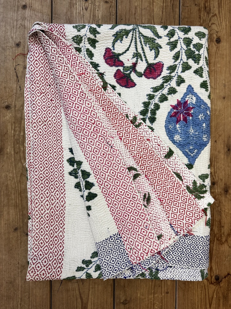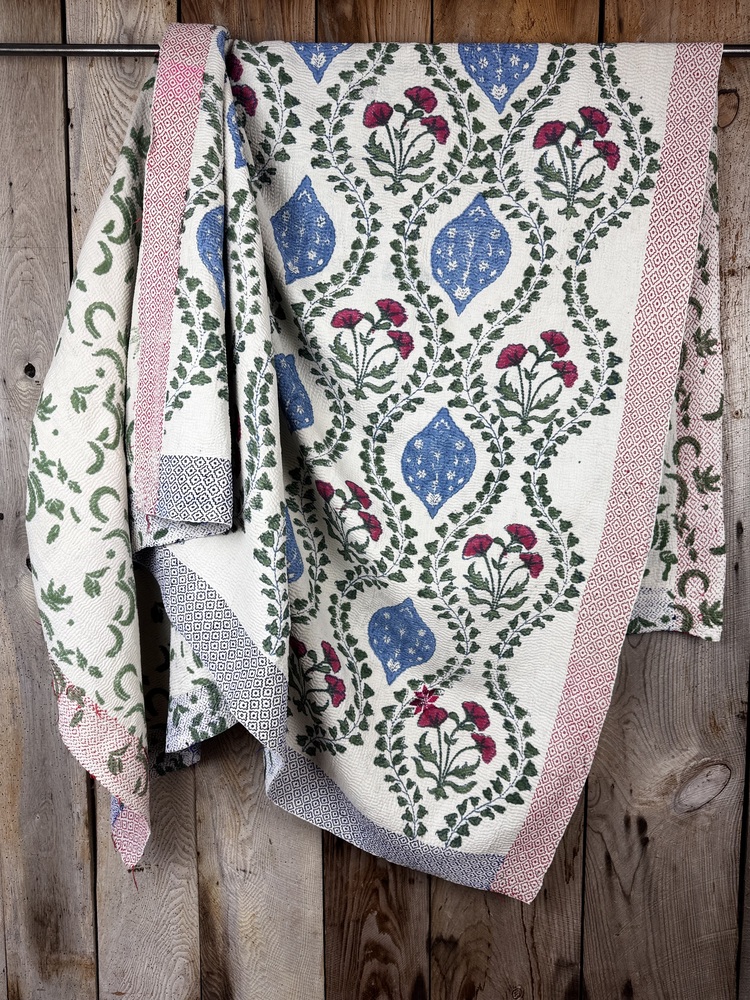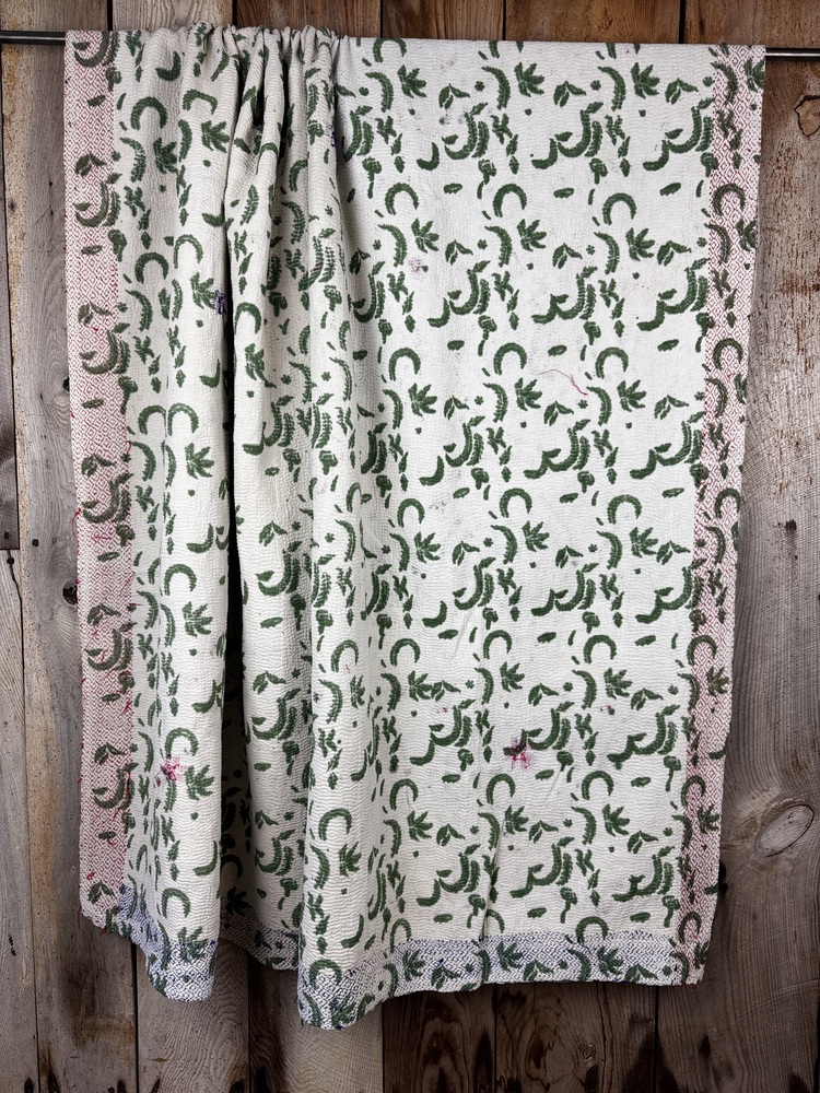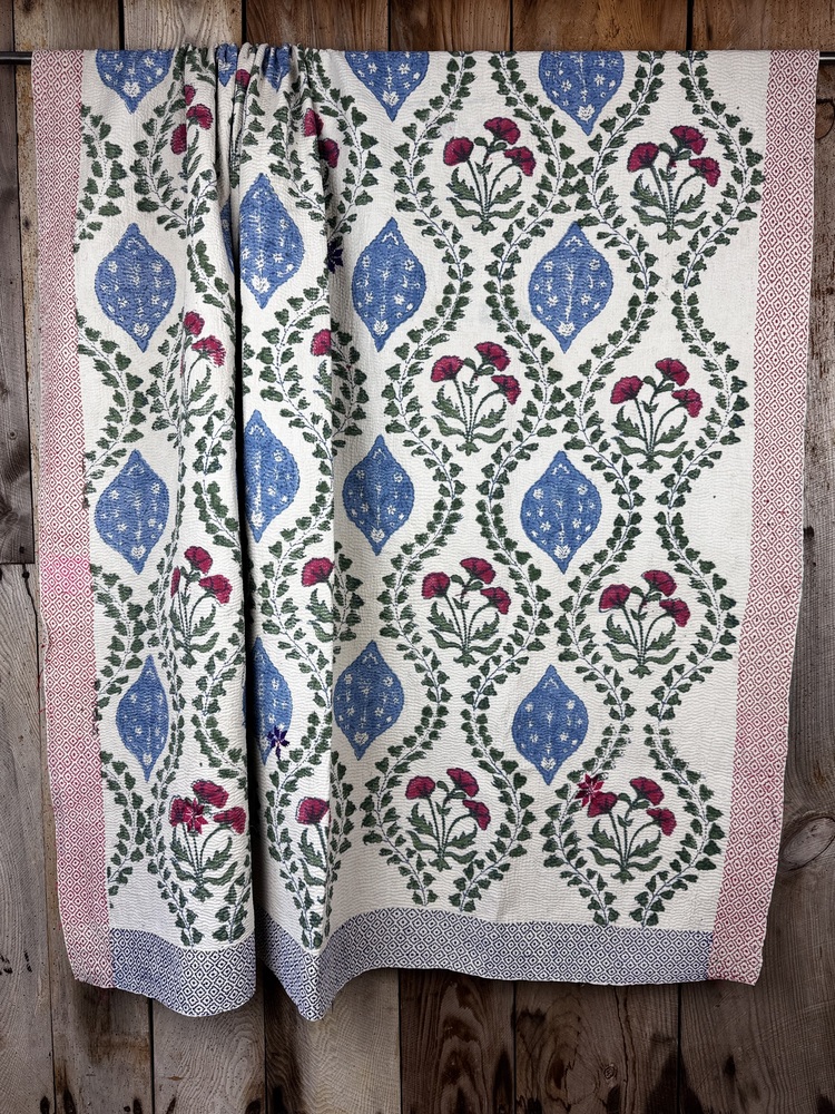 Perfect in their imperfections, each piece is unique. This finely-stitched block printed kantha quilt is made from up to 6 layers of vintage 100% cotton sari and sewn together with thousands of tiny running stitches. A product of female resourcefulness and creativity, Kantha is an age-old Indian tradition. Fabrics are between 40-80 years old. Every quilt is carefully selected for its condition, design, and authentic appeal. Freshly washed to ensure softness.