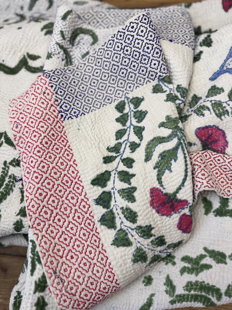 Block printed Kantha Quilt. These are white-based vintage quilts which have been recently hand printed with traditional motifs and designs.