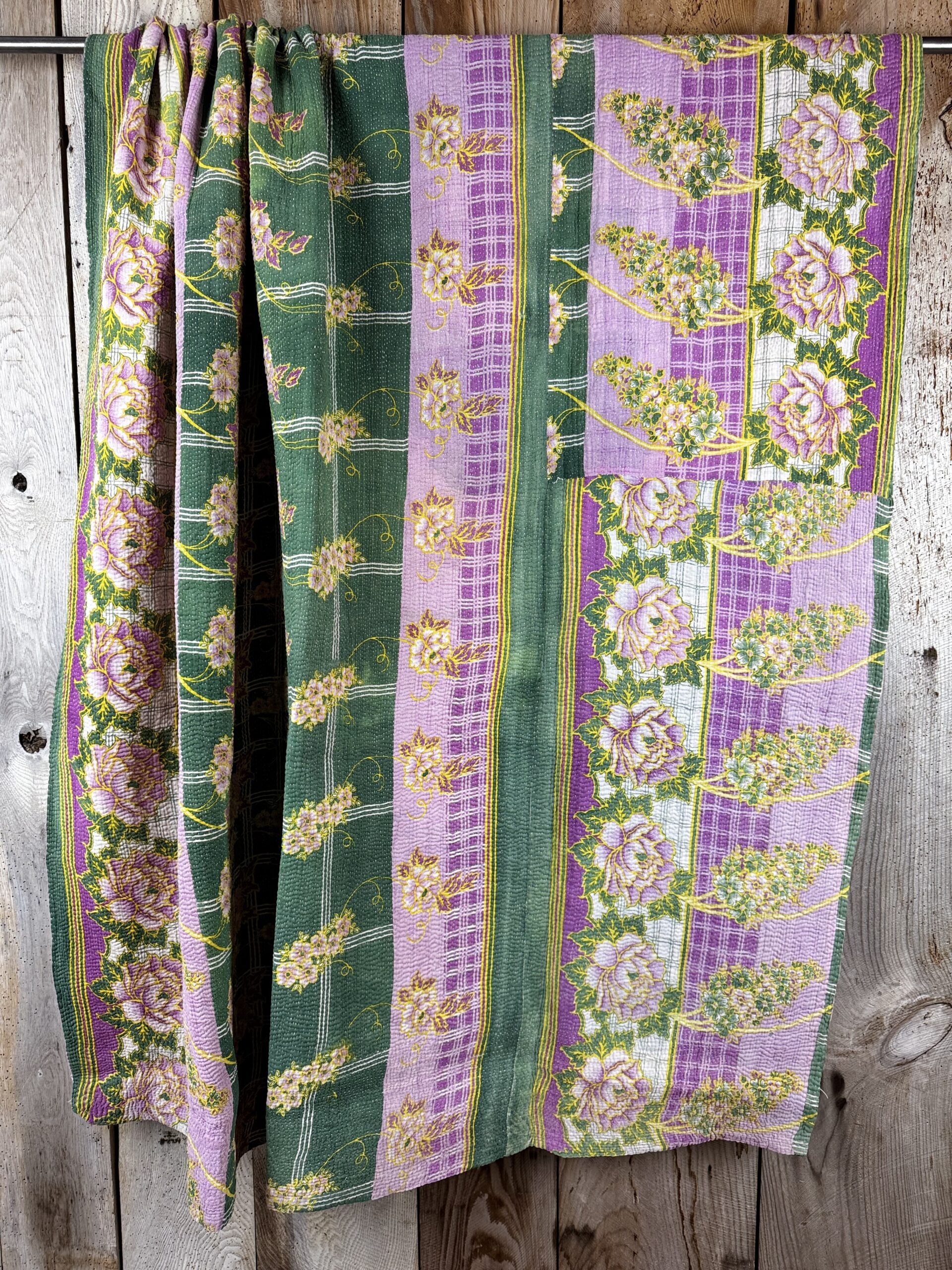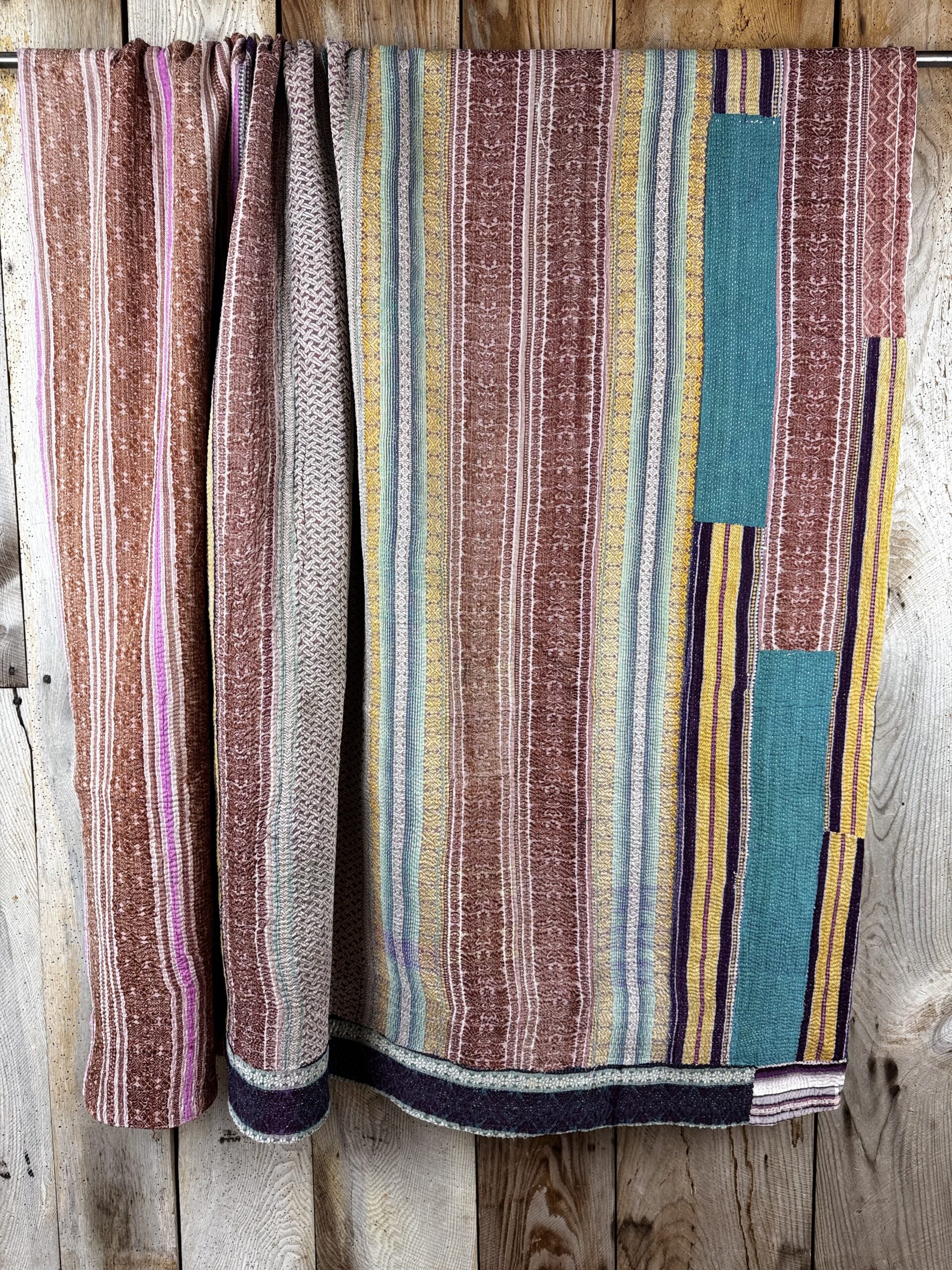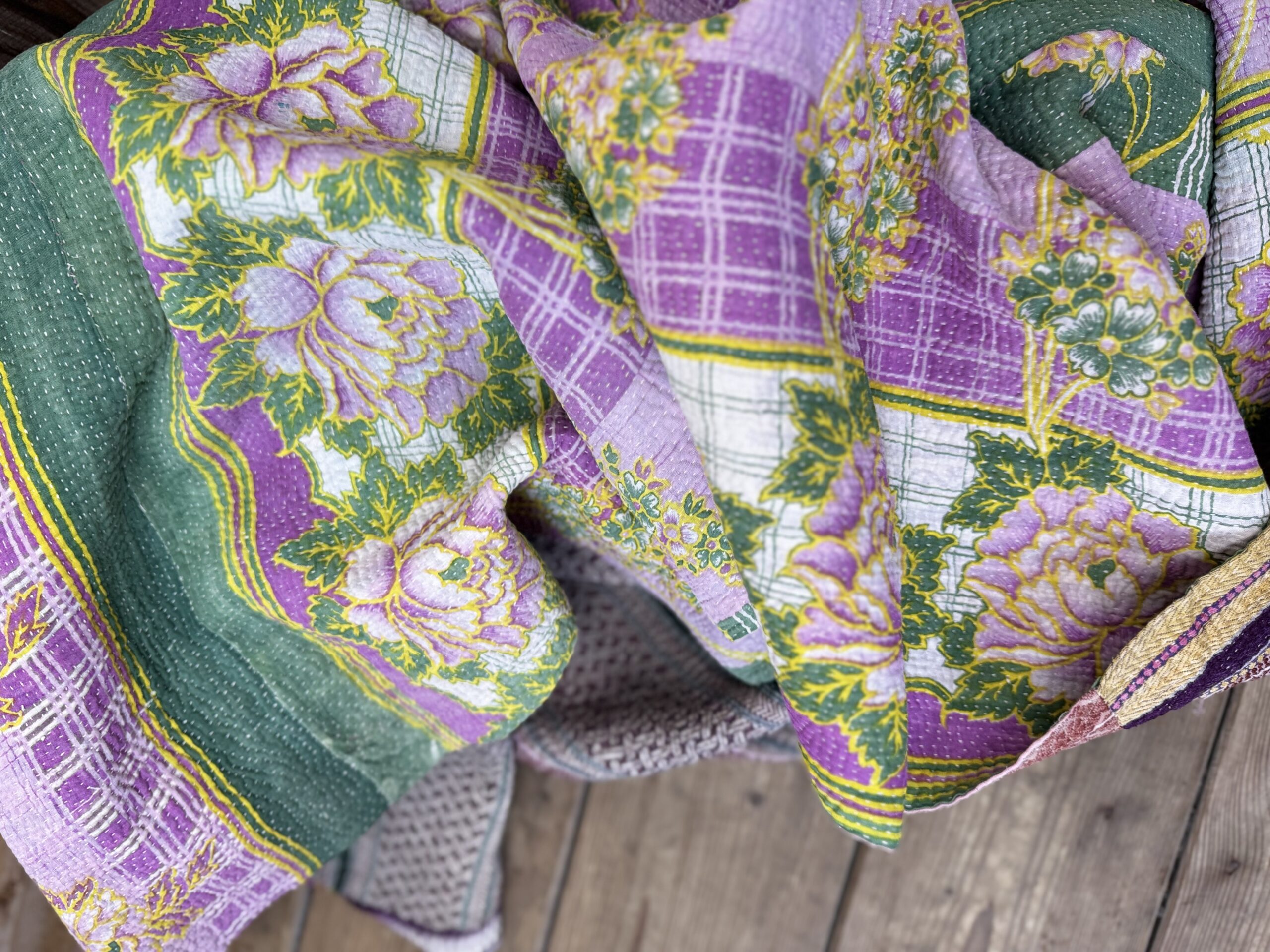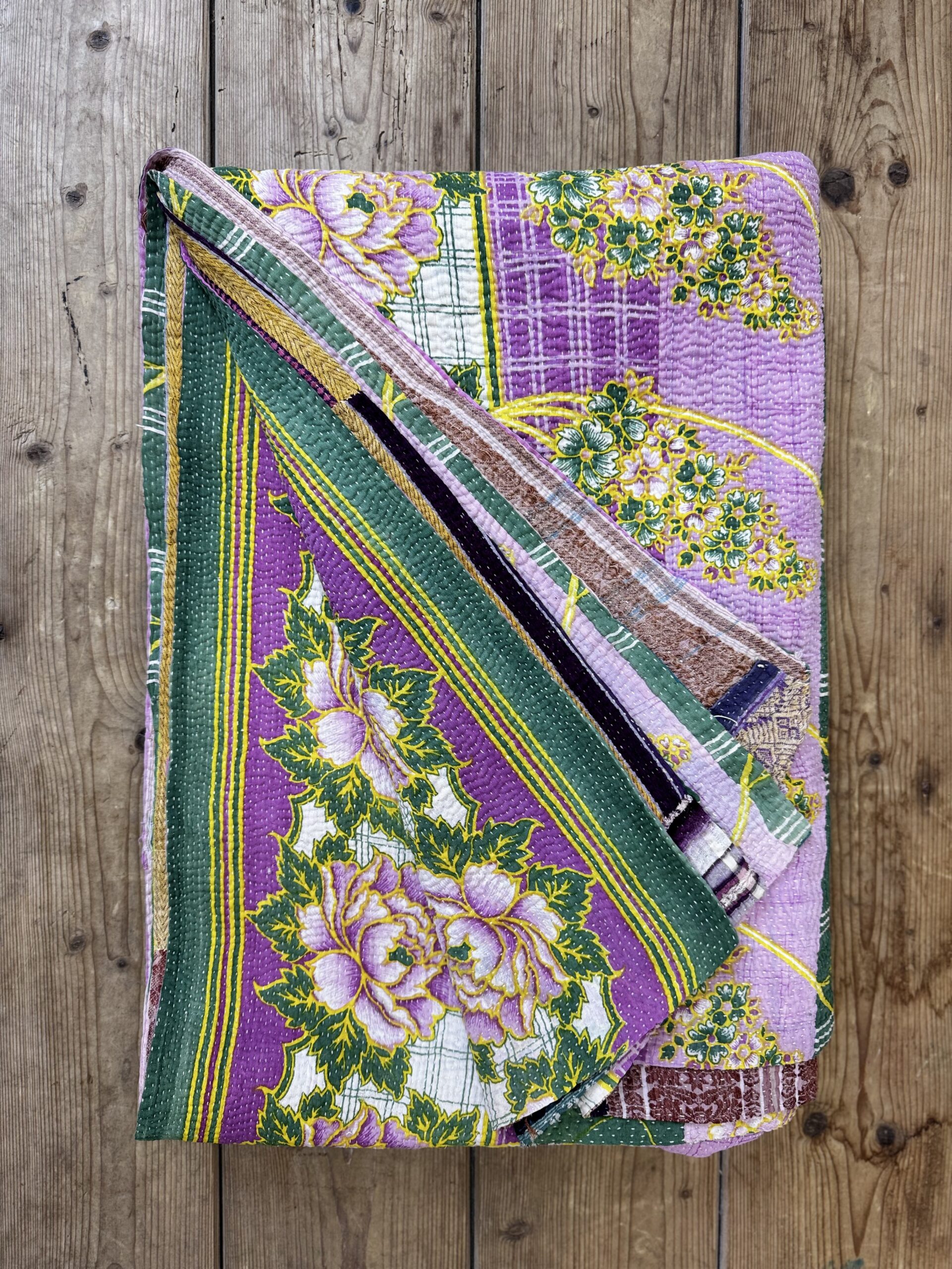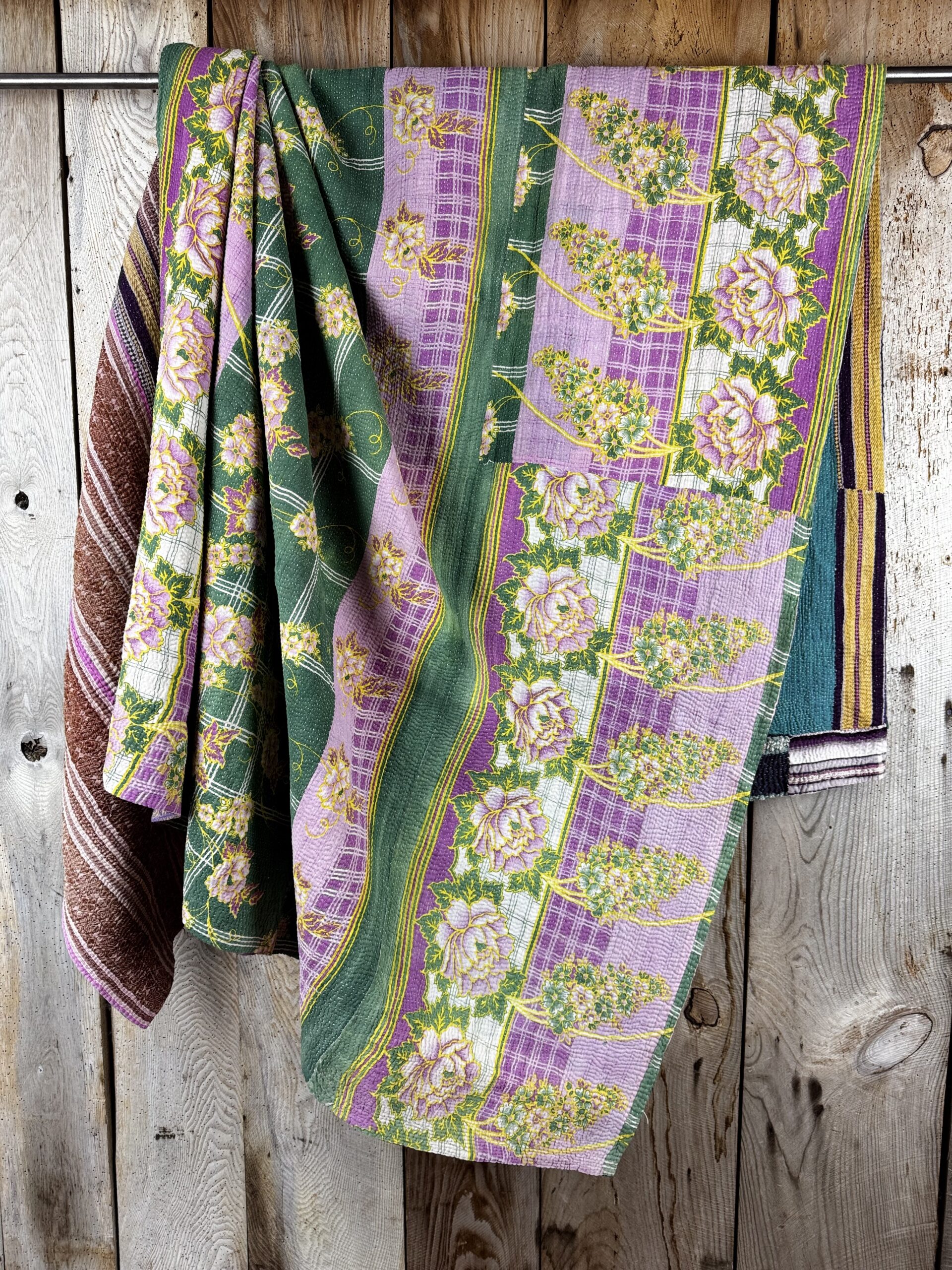 Perfect in their imperfections, each piece is unique. This finely-stitched kantha quilt is made from up to 6 layers of vintage 100% cotton sari and sewn together with thousands of tiny running stitches. A product of female resourcefulness and creativity, Kantha is an age-old Indian tradition. Fabrics are between 40-80 years old. Every quilt is carefully selected for its condition, design, and authentic appeal. Freshly washed to ensure softness.
