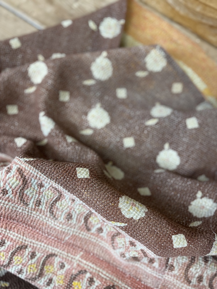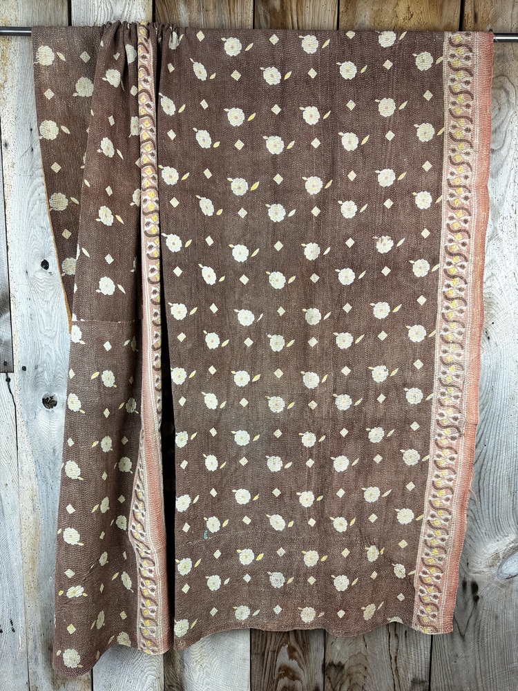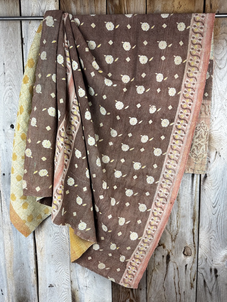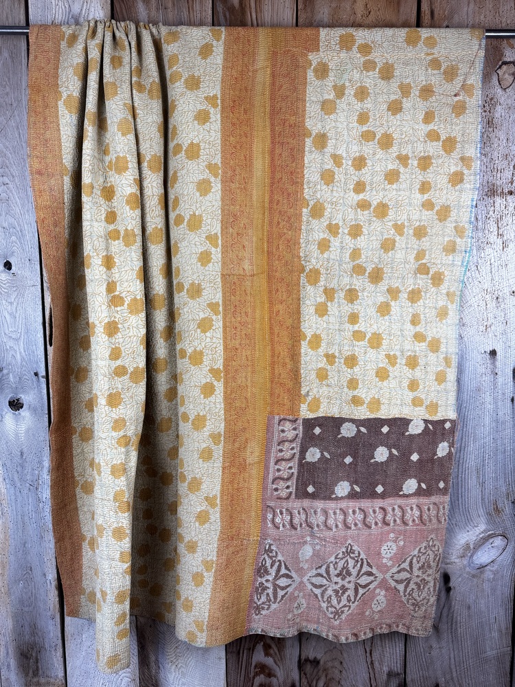 Perfect in their imperfections, each piece is unique. This finely-stitched kantha quilt is made from up to 6 layers of vintage 100% cotton sari and sewn together with thousands of tiny running stitches. A product of female resourcefulness and creativity, Kantha is an age-old Indian tradition. Fabrics are between 40-80 years old. Every quilt is carefully selected for its condition, design, and authentic appeal. Freshly washed to ensure softness.