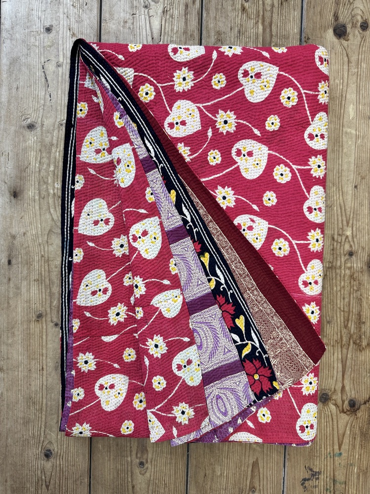 Perfect in their imperfections, each piece is unique. This finely-stitched kantha quilt is made from up to 6 layers of vintage 100% cotton sari and sewn together with thousands of tiny running stitches. A product of female resourcefulness and creativity, Kantha is an age-old Indian tradition. Fabrics are between 40-80 years old. Every quilt is carefully selected for its condition, design, and authentic appeal. Freshly washed to ensure softness.