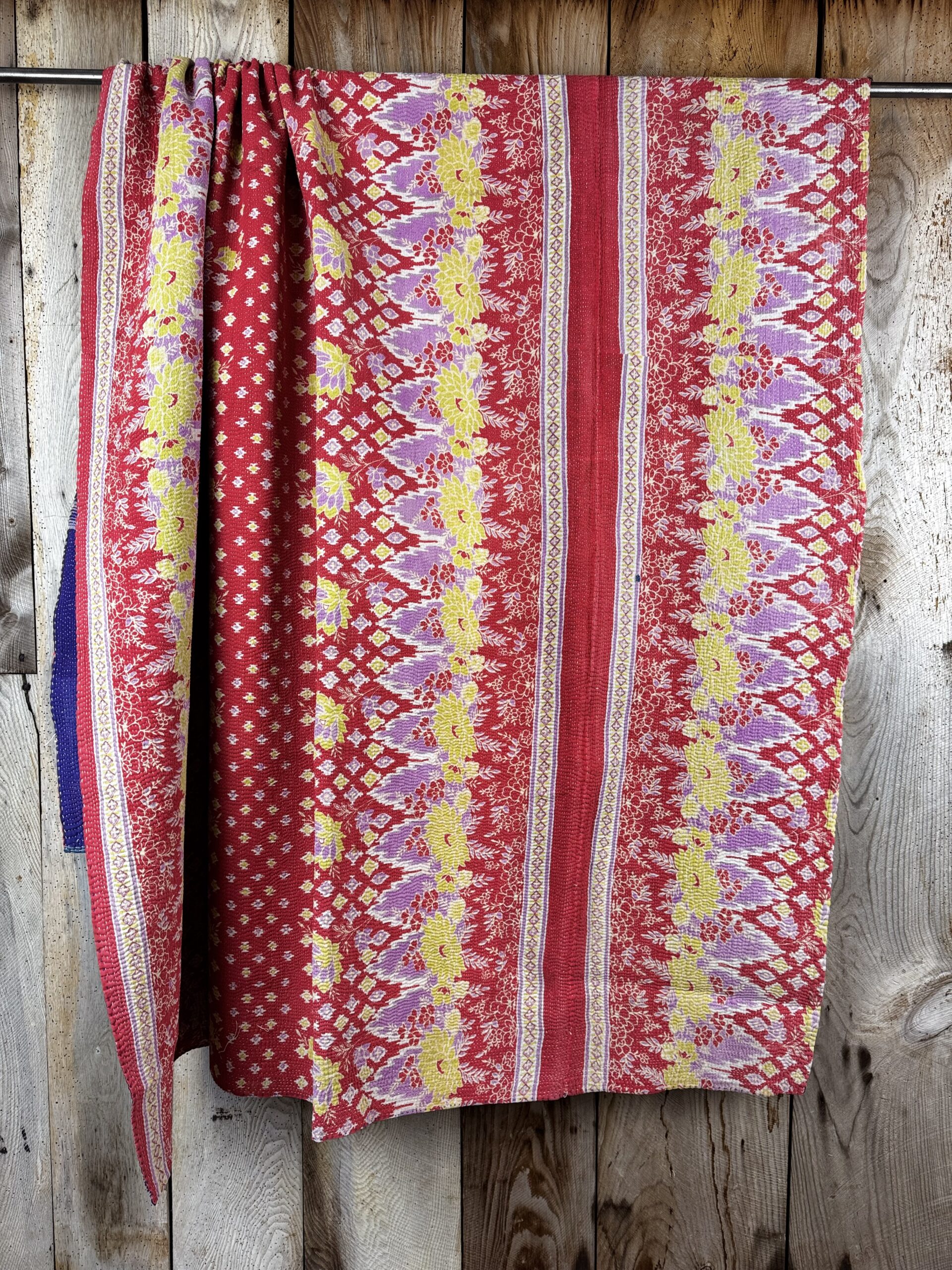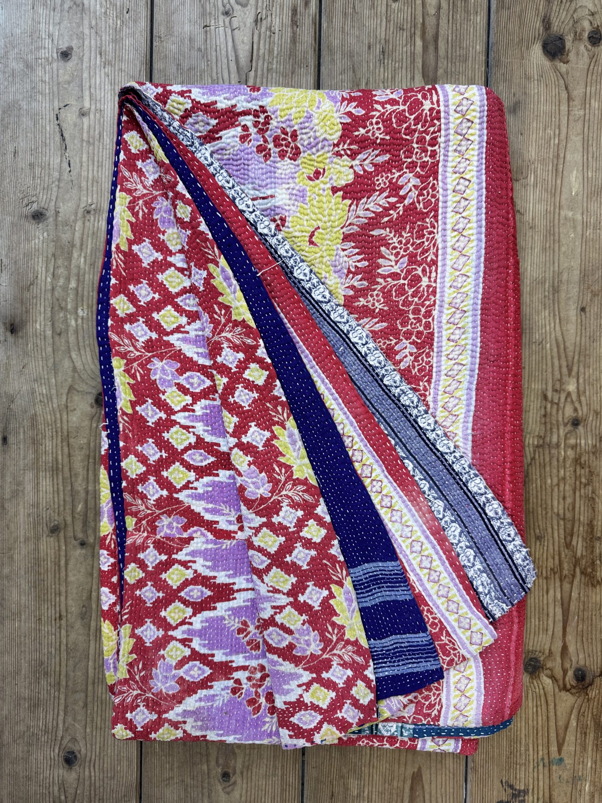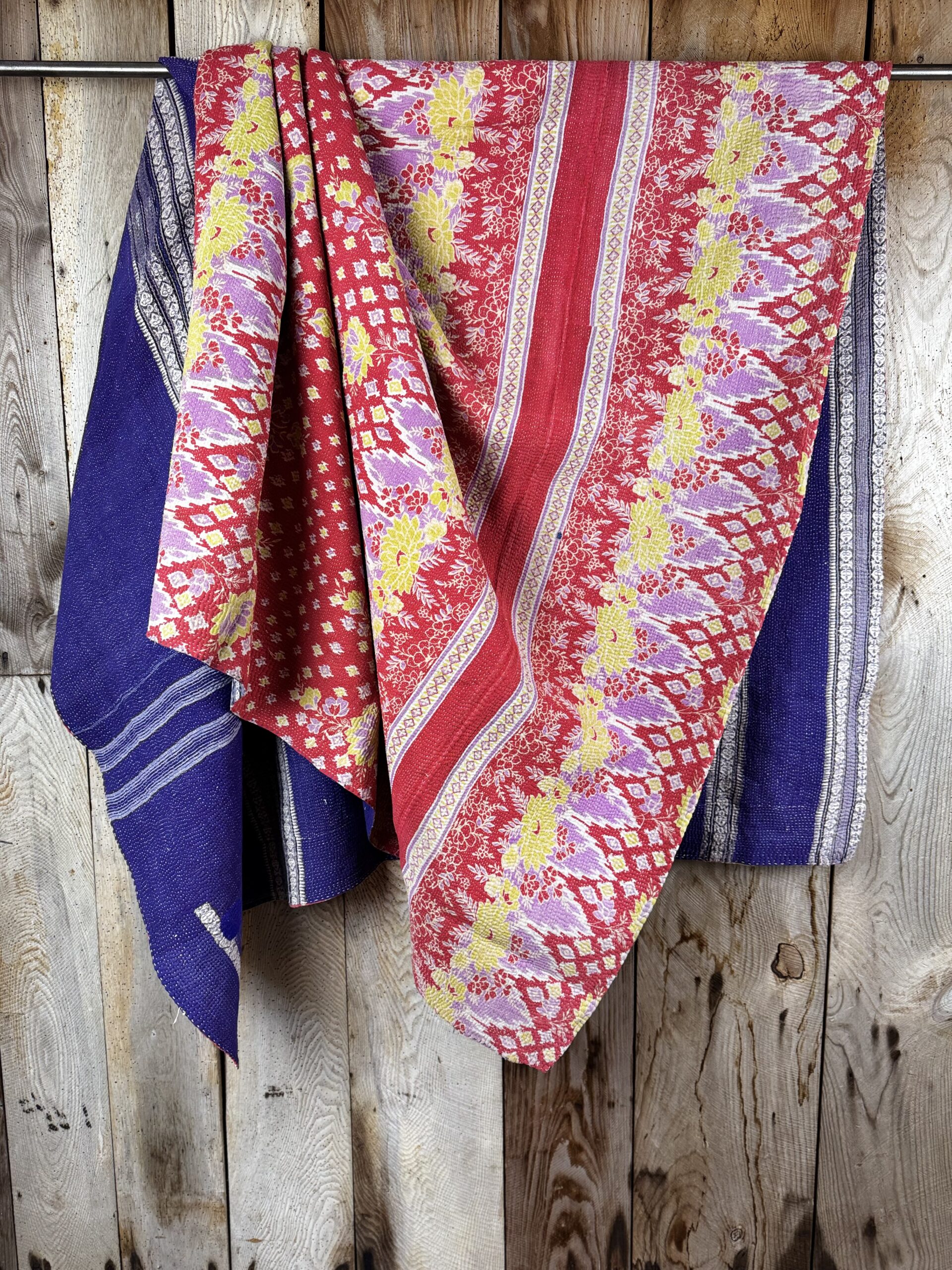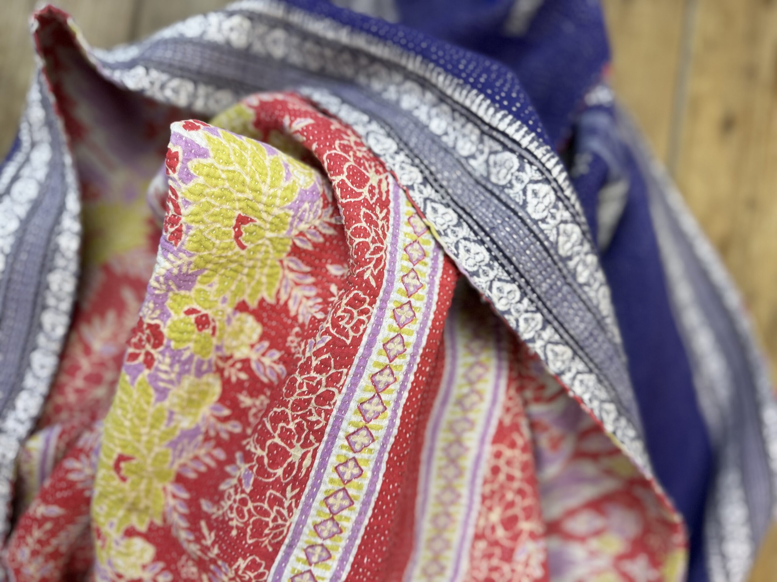 Perfect in their imperfections, each piece is unique. This finely-stitched kantha quilt is made from up to 6 layers of vintage 100% cotton sari and sewn together with thousands of tiny running stitches. A product of female resourcefulness and creativity, Kantha is an age-old Indian tradition. Fabrics are between 40-80 years old. Every quilt is carefully selected for its condition, design, and authentic appeal. Freshly washed to ensure softness.