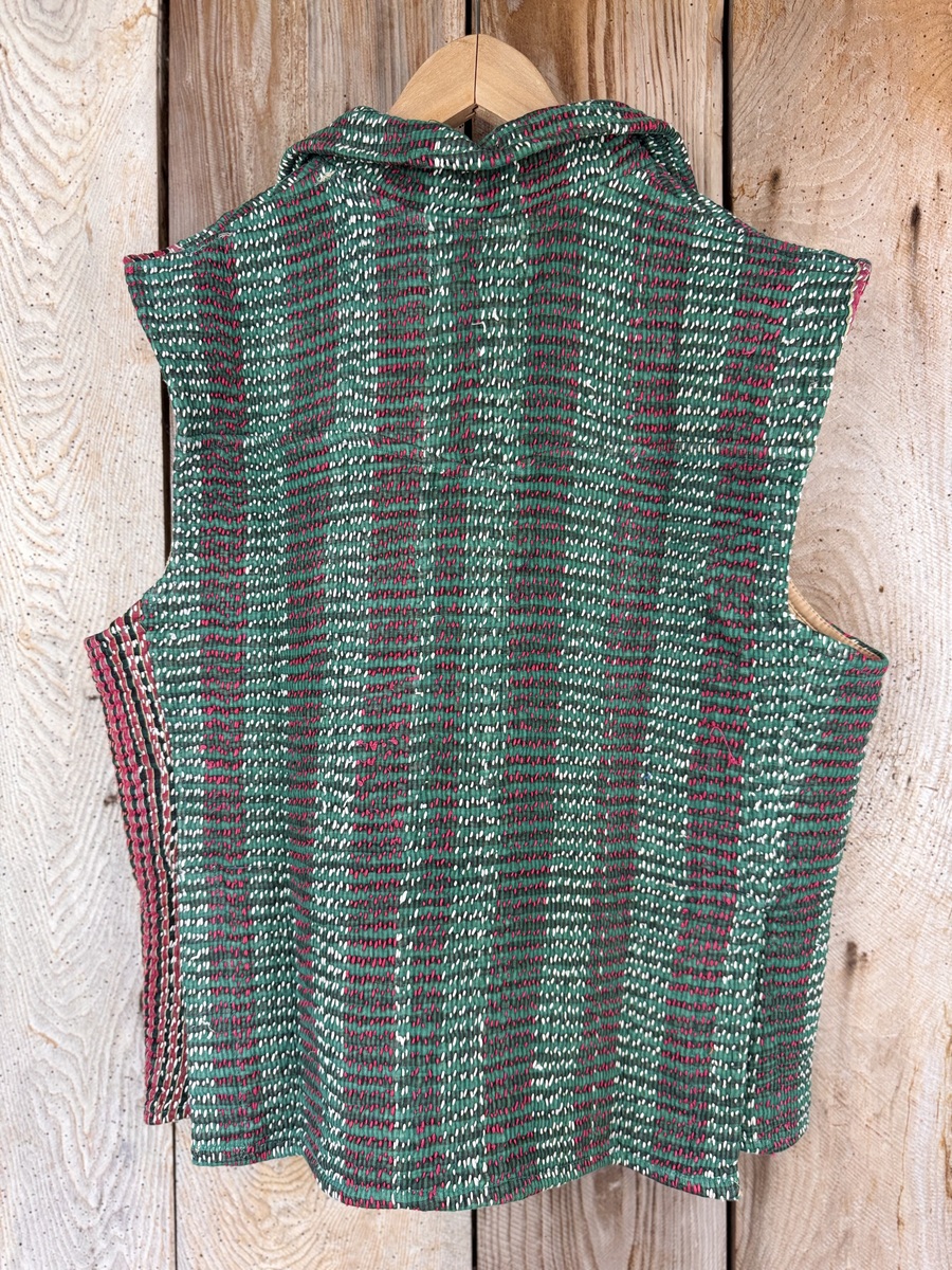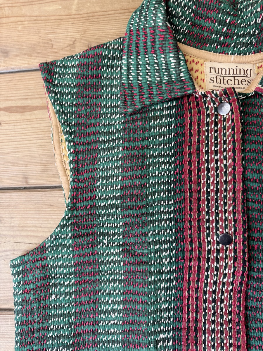 Crafted with care from a finely-stitched single vintage kantha quilt, this waistcoat is a sustainable wardrobe choice to last forever. With unique character, each is one-of-a-kind. Medium-weight, ideal for layering in different seasons.