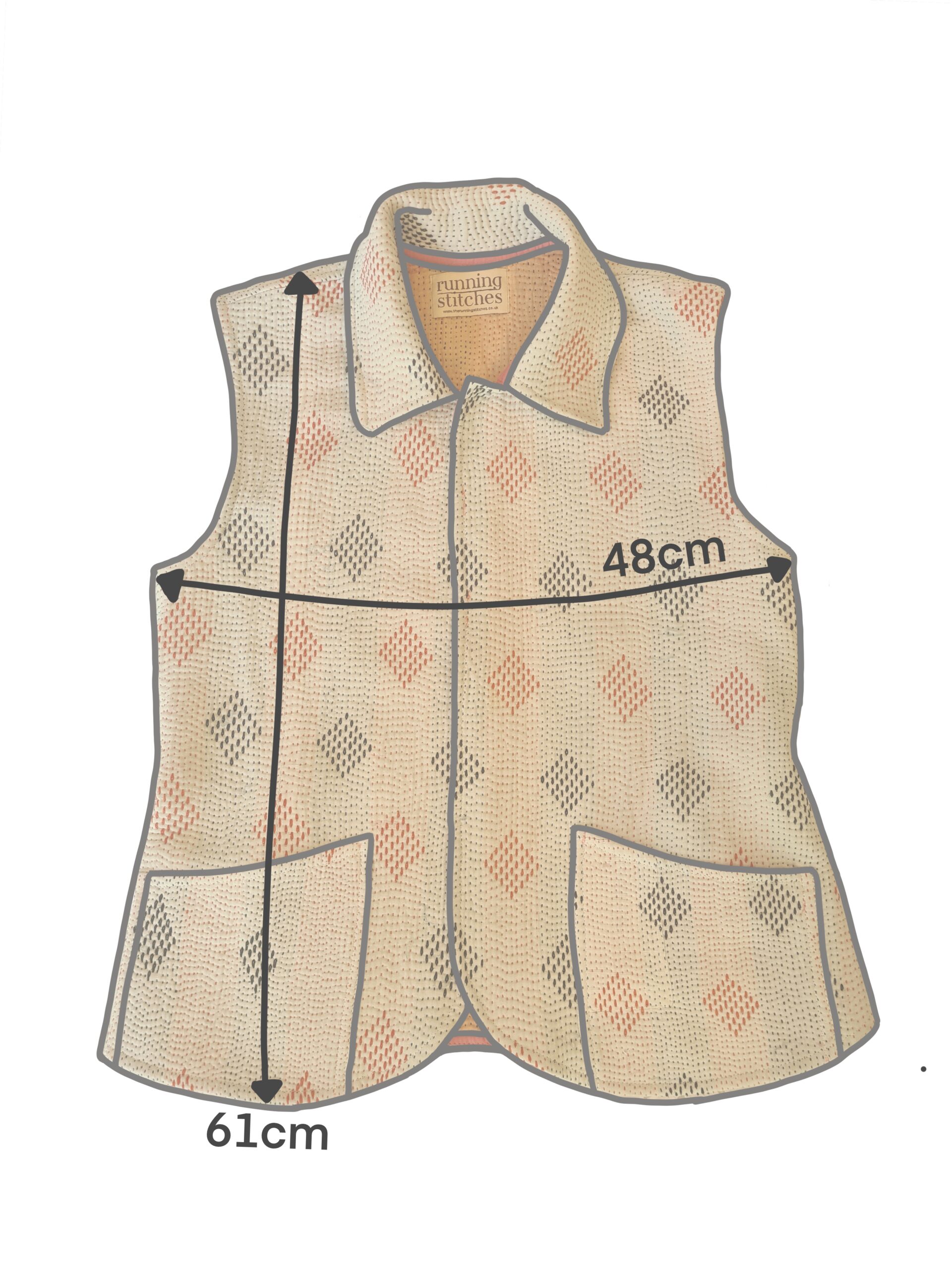 Crafted with care from a finely-stitched single vintage kantha quilt, this waistcoat is a sustainable wardrobe choice to last forever. With unique character, each is one-of-a-kind. Medium-weight, ideal for layering in different seasons.
