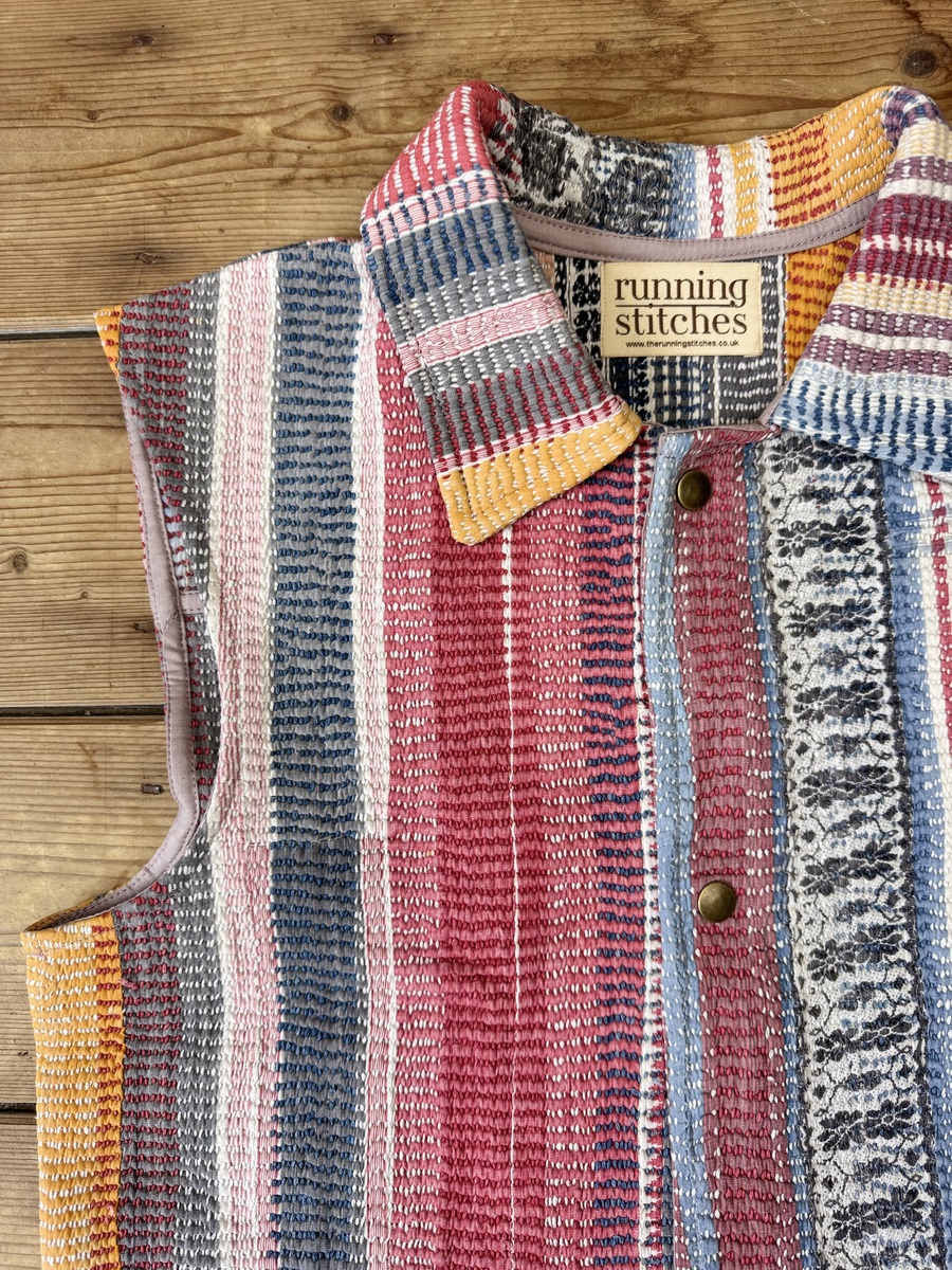 Crafted with care from a finely-stitched single vintage kantha quilt, this waistcoat is a sustainable wardrobe choice to last forever. With unique character, each is one-of-a-kind. Medium-weight, ideal for layering in different seasons.
